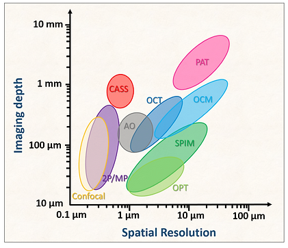 There have been numerous studies that have attempted to resolve the detrimental effect of multiple light scattering. However, their performance in spatial resolution is compromised with an increase of target depth to such an extent that the ratio of imaging depth to spatial resolution stays around 100 (Figure below). Those approaches that can reach deep inside tend to lose spatial resolution because they rely on the statistical analysis of multiple light scattering, rather than the microscopic details of the scattering events. The approaches covering the other extreme of high spatial resolution tend to be near-sighted because of their inability to tell single- from multiple-scattered waves. With the increase of target depth, the signal strength of single-scattered waves decays exponentially at a length scale set by the scattering mean free path, which is on the order of 100 microns in biological tissues. Conventional high-resolution optical imaging modalities were, therefore, unable to cope with the decreasing ratio of single scattering signal to the multiple scattering backgrounds. First-order corrections have been made to the low-order Zernike polynomial in adaptive optics, but the resulting improvement has been marginal.
