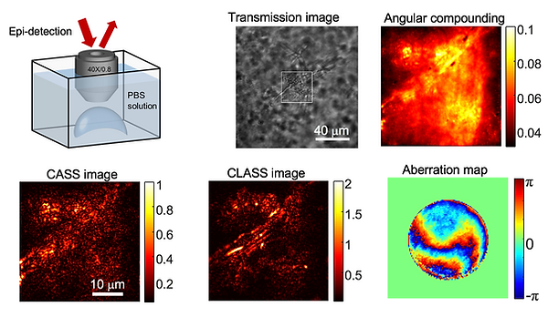 Abstract: Thick biological tissues give rise to not only the multiple scattering of incoming light waves, but also the aberrations of remaining signal waves. The challenge for existing optical microscopy methods to overcome both problems simultaneously has limited sub-micron spatial resolution imaging to shallow depths. Here we present an optical coherence imaging method that can identify aberrations of waves incident to and reflected from the samples separately, and eliminate such aberrations even in the presence of multiple light scattering. The proposed method records the time-gated complex-field maps of backscattered waves over various illumination channels, and performs a closed-loop optimization of signal waves for both forward and phase-conjugation processes. We demonstrated the enhancement of the Strehl ratio by more than 500 times, an order of magnitude or more improvement over conventional adaptive optics, and achieved a spatial resolution of 600 nm up to an imaging depth of seven scattering mean free paths.
